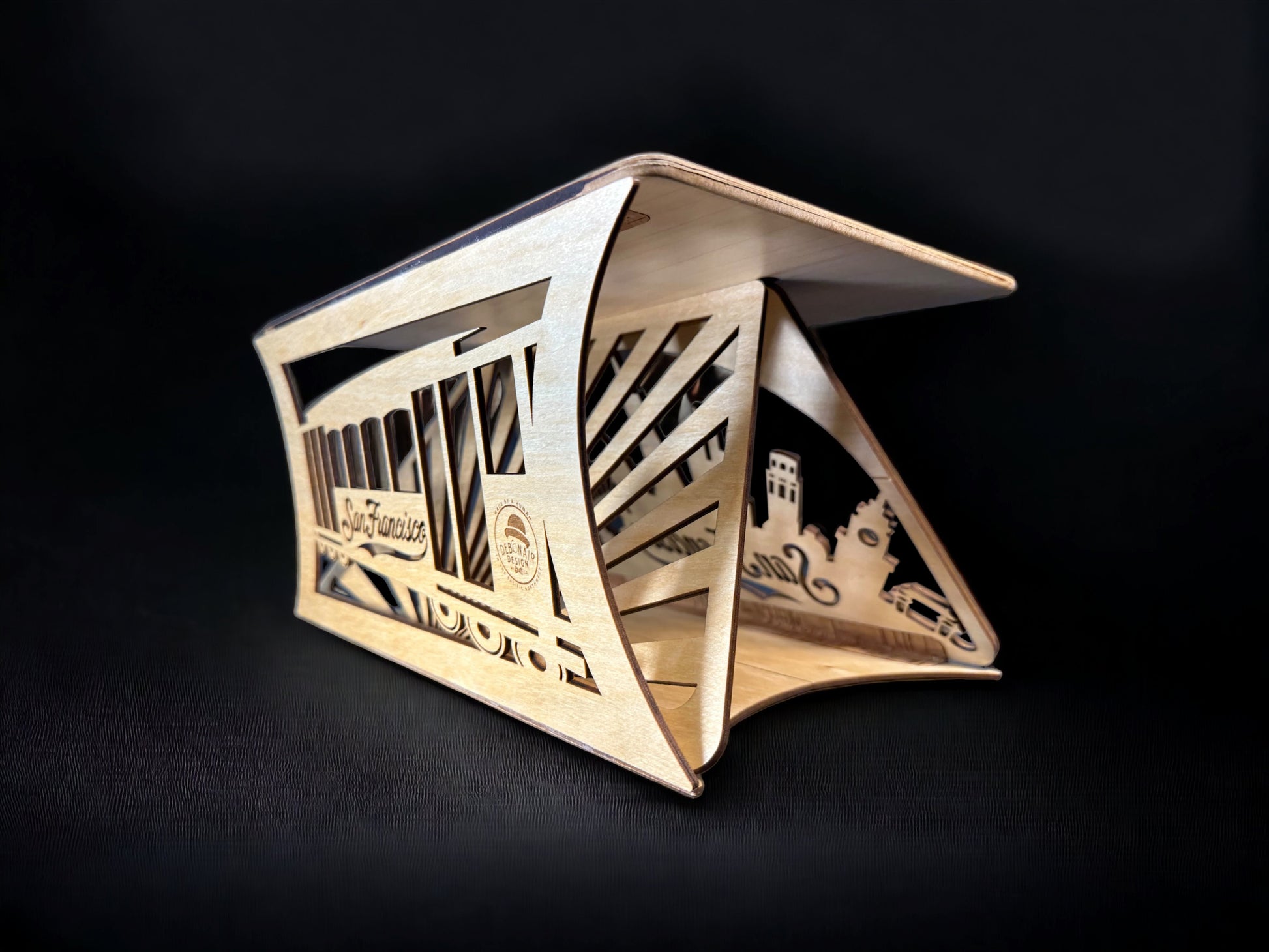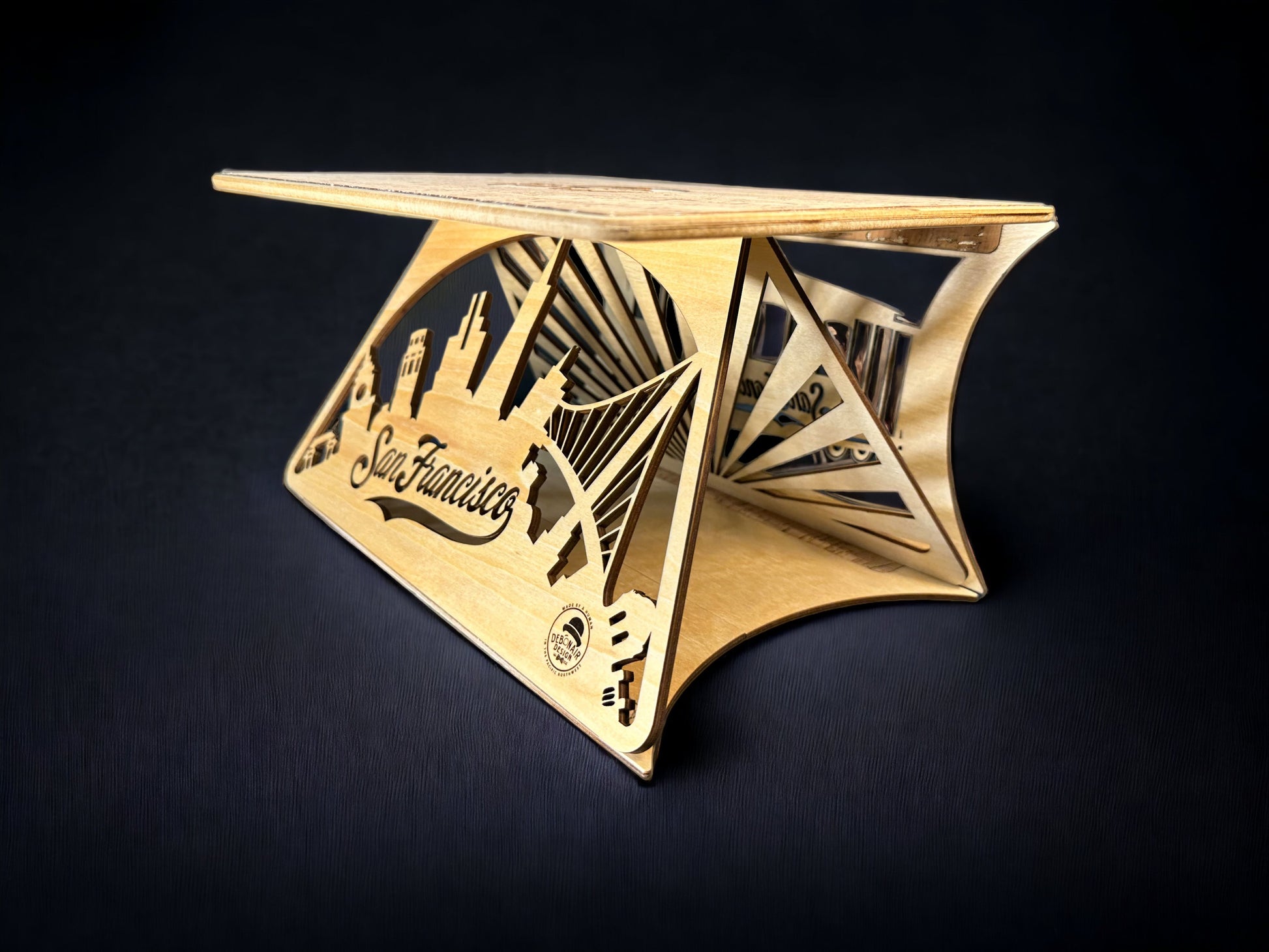 Experience San Francisco's vibrant spirit with our innovative folding laptop stand. Crafted with high-quality Baltic birch plywood and natural cork, it embodies elegance and functionality in a truly unique and eco-friendly design.